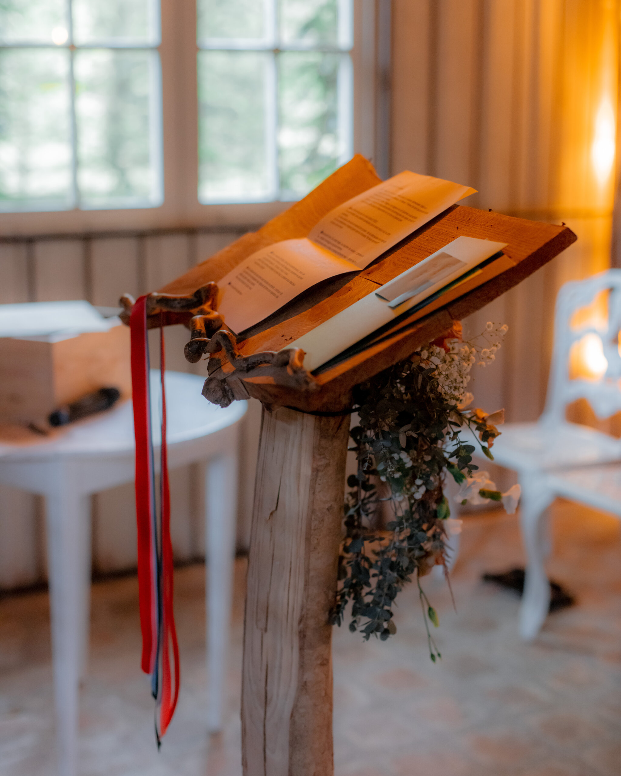 Le lieu, déjà sublime, est simplement sublimé. Des paravents habillés de fleurs dessinent une arche délicate, tandis que le pupitre en bois s’inscrit naturellement dans cette scénographie douce et épurée.